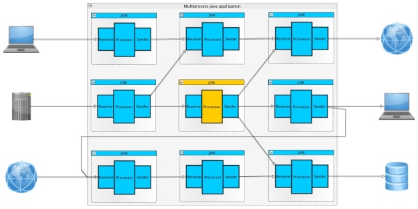Enterprise Integration Patterns are the key to clearly define context for each java process as well as how to put all java processes together into a solid multi-process application. The simplest SRP-compliant java process could have the following components: Receiver, Processor and Sender: